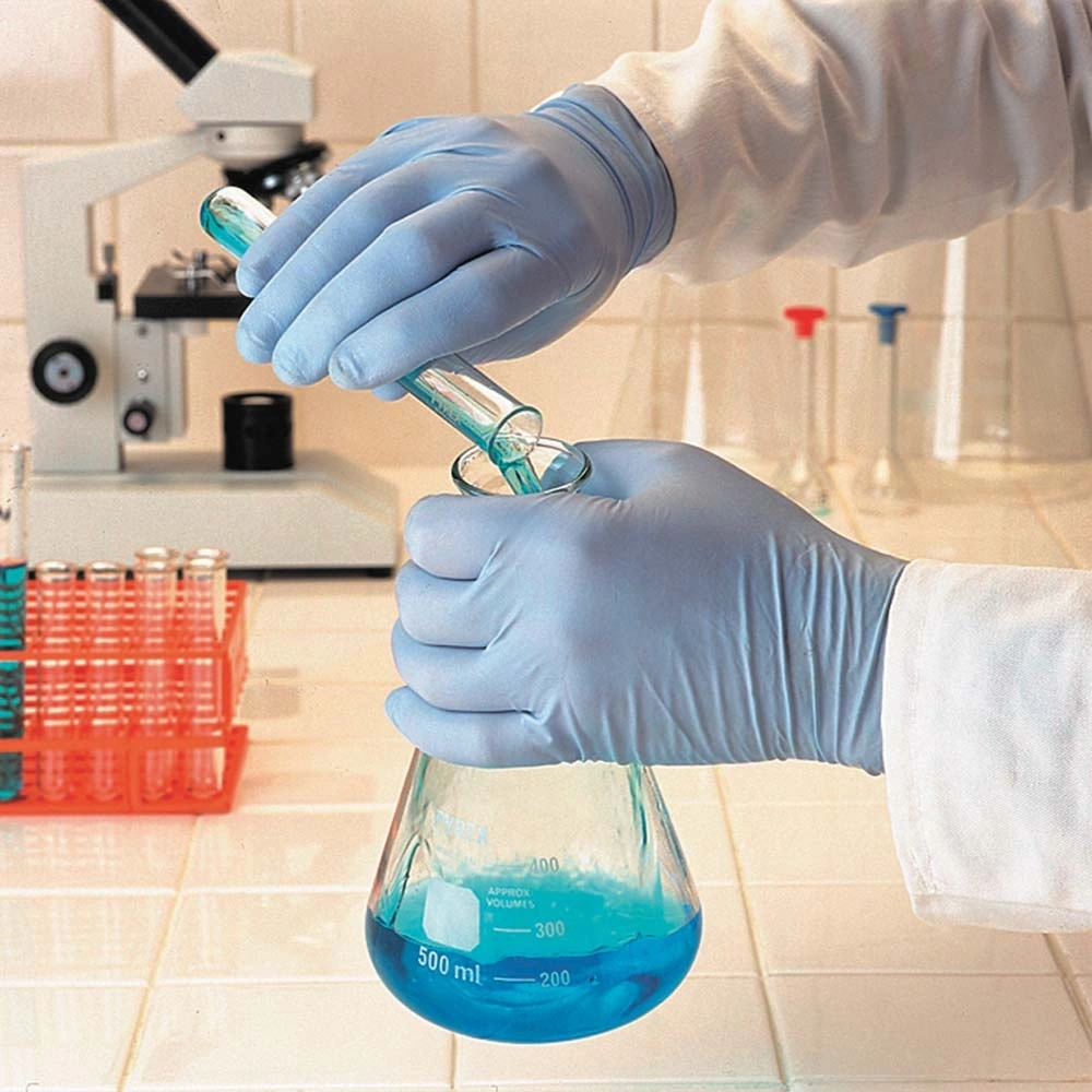 Manusi de unica folosinta din 100% nitril fara aditivi, grosime de 0,12 mm, terminatia rulata , culoare albastra, lungime totala 24 cm.