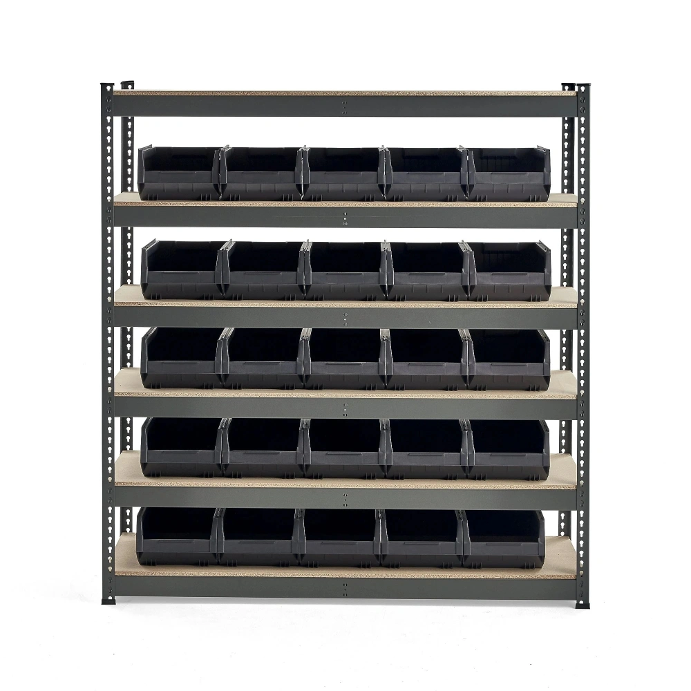 Raftul este furnizat cu recipiente solide din plastic. Containerele sunt fabricate din polipropilenă reciclabilă și rezistă la temperaturi de la -40 °C până la +90 °C. De asemenea, sunt rezistente la acizi, uleiuri de motor și majoritatea substanțelor chimice. Containerele de depozitare din plastic sunt stivuibile și au o față deschisă, ceea ce face mai ușor să vezi și să accesezi conținutul containerului.