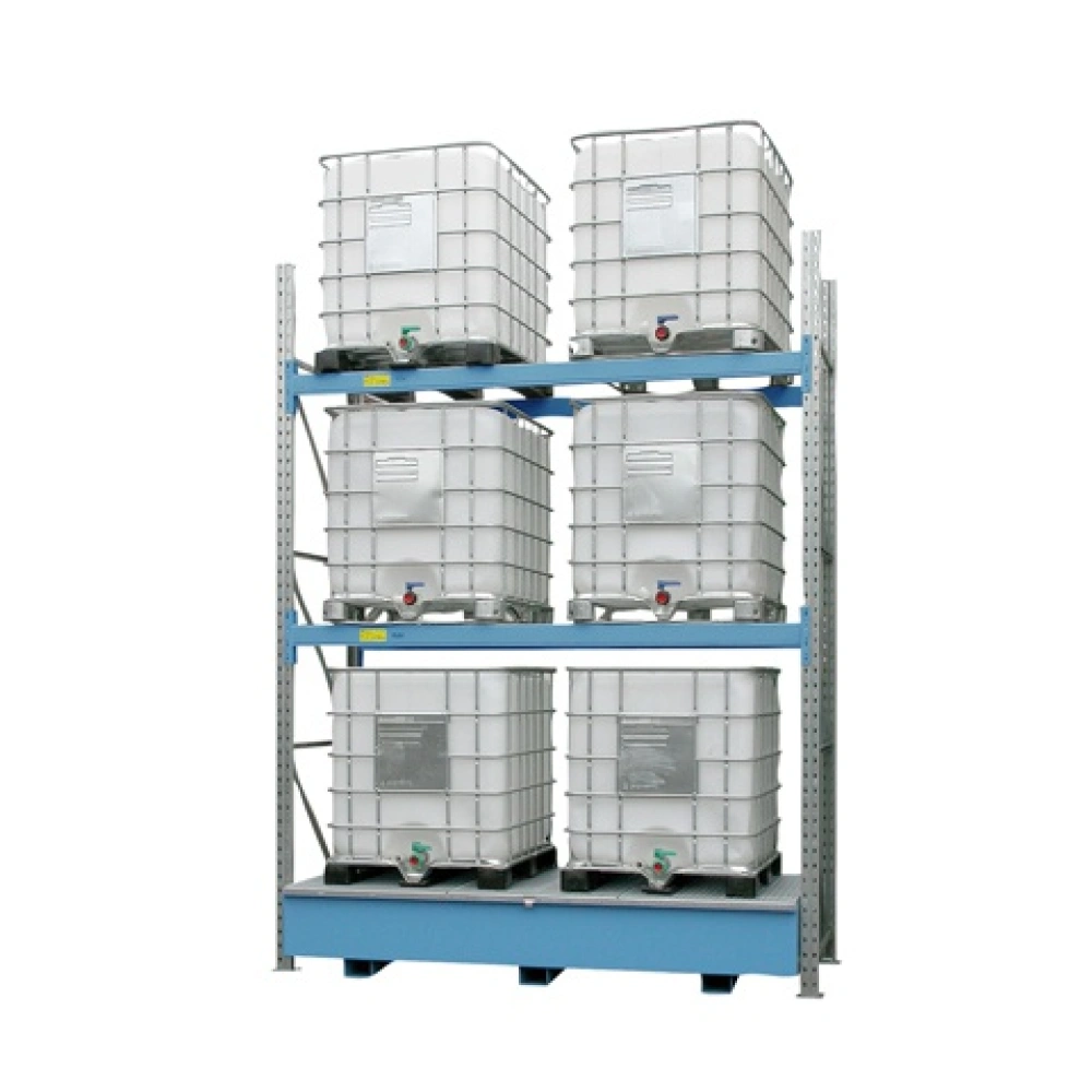 - pretabile pentru 6 containere IBC, se potrivesc si pentru europaleti. Usor de asamblat, rafturile mobile, pot fi reglate la un interval de 5 cm, toate elementele sunt realizate din metal galvanizat, pentru a asigura o protectie sporita la agenti chimici, umezeala si rugina. Raftul se poate utiliza cu succes si in exterior.