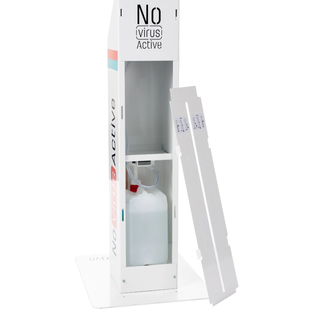 Standul de dezinfecție a mâinilor NovirusActive nu este doar un design, ci și un ajutor practic pentru menținerea unui mediu igienic. O persoană care își dezinfectează mâinile nu trebuie să ajungă la nimic cu mâinile sale. Dezinfectarea este dozată de o pedală. Partea superioară a standului NovirusActive funcționează ca o zonă de informații. Dispenserul de dezinfectare este ascuns în interiorul suportului. Înlocuirea cartușului din suport este rapidă și ușoară. Standul este potrivit pentru gelul de mână igienic fără clătiri 5l - HC N435. Cu gelul de 5 l fără clătire, suportul distribuie mai mult de 3.000 de doze de 1,5 ml. O doză de dezinfecție este mai mică de 0,10 RON. Standul are un recipient pentru două canistre de 5l. Trageți dezinfectarea dintr-un recipient, iar celălalt acționează ca o rezervă. Puteți regla doza pe care o distribuie standul cu o singură apăsare. Volumul unei doze de gel dezinfectant este presetat la 1,5 ml. Utilizarea dezinfectantului lichid este posibilă în ceea ce privește picurările după dozare. Furnizăm suportul NovirusActive ca produs complet, nu este necesară asamblarea suplimentară. Puteți purta cu ușurință suportul NovirusActive. Dacă este necesar, poate fi ancorat la sol. Standul pentru dezinfectare poate fi amplasat în spații interioare și exterioare