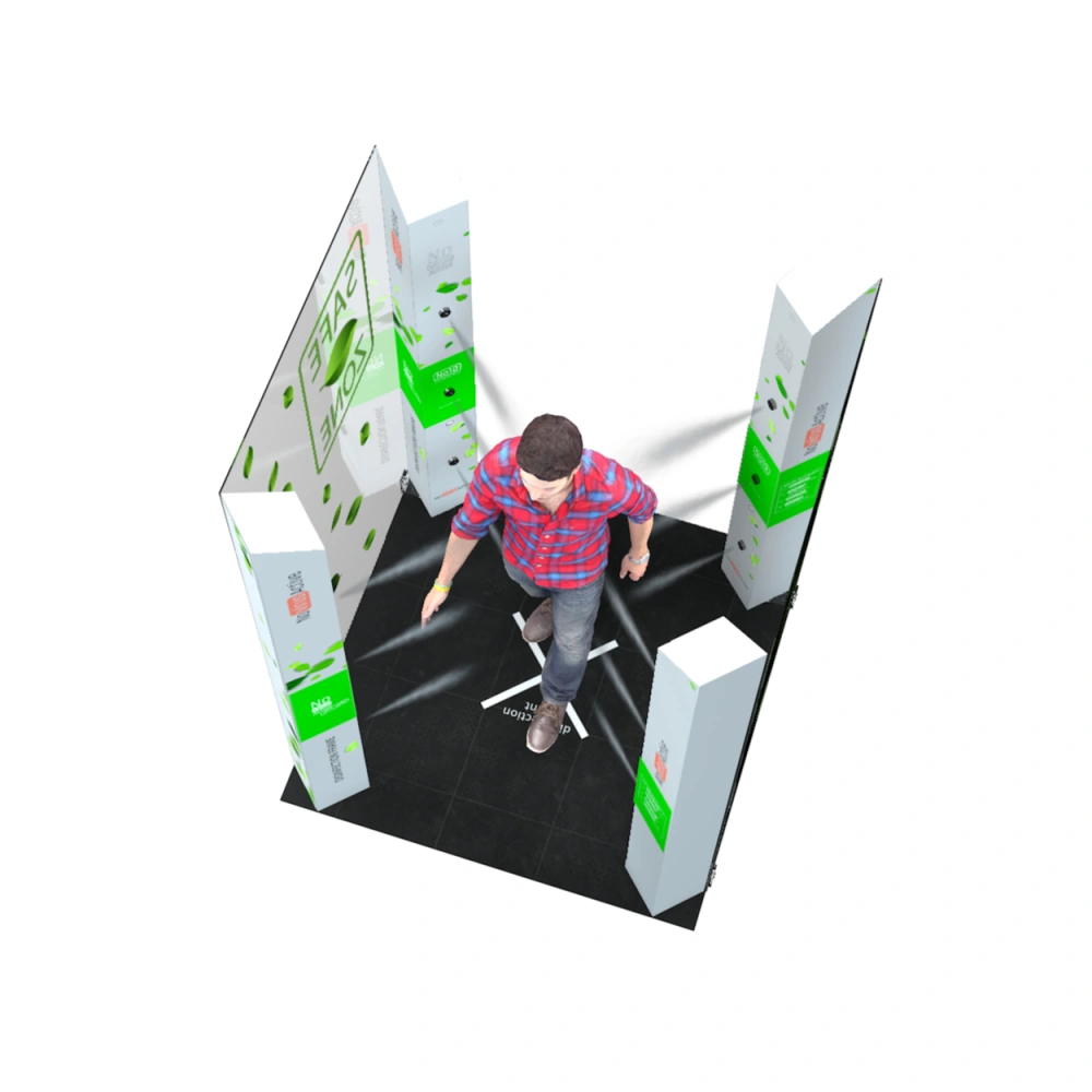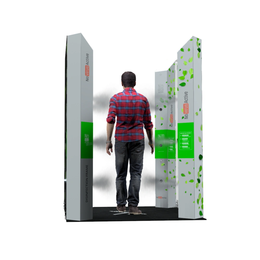 UTILIZARE Plasați poarta de dezinfecție a afacerilor la intrările la locul de muncă sau în alt loc cu mișcare sporită de oameni. Oamenii pot trece apoi printr-un proces de dezinfecție după ce intră pe poartă. Persoana intră în zona porții de dezinfecție, începând astfel procesul de dezinfecție. O voce o îndeamnă să închidă ochii și solutia dezifectanta se pulverizeaza. În cele din urmă, vocea anunță că este posibil să părăsiți zona porții. În acel moment, spațiul este pregătit pentru o altă persoană.