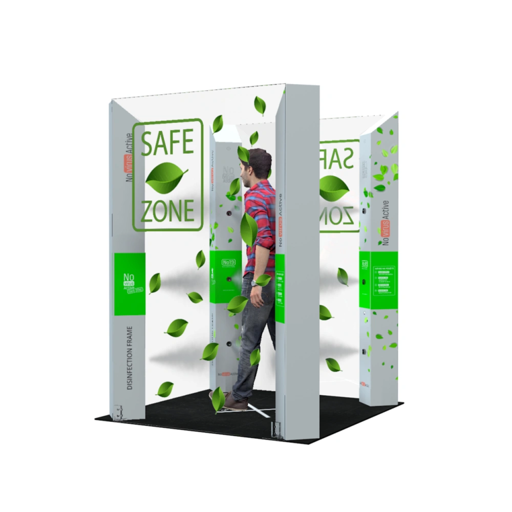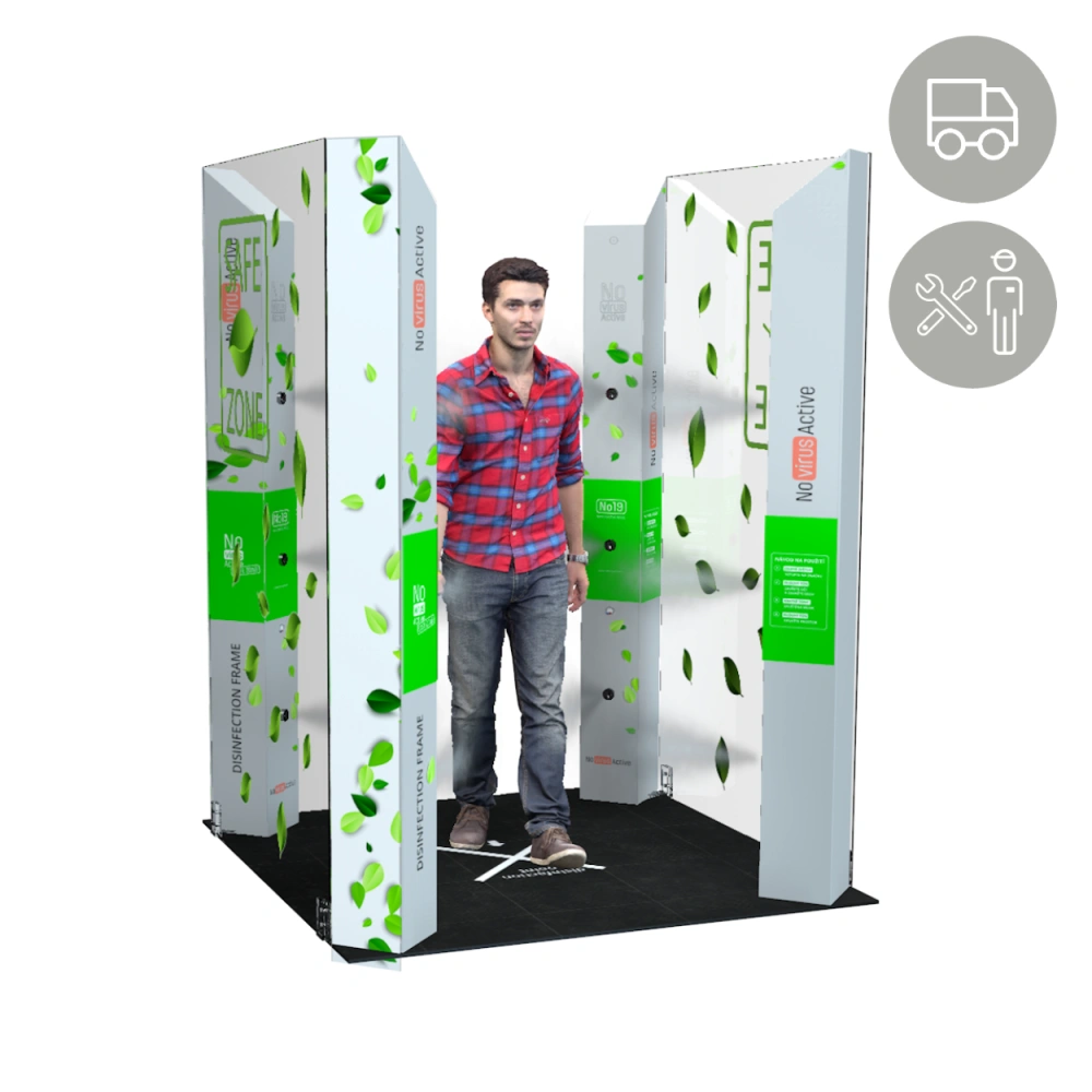 Poarta de dezinfectare business, capacitate 900 persoane / h, dezinfectarea de 25 l constă dintr-o coloană cu 12 duze, un suport pentru dezinfectarea mâinilor și o coloană cu un panou de informații. Coloana din panoul de informații conține instrucțiuni pentru utilizarea porții de dezinfecție. Vizavi de coloana principală cu duze, sticla este montată astfel încât ceața dezinfectantă să nu scape inutil. Coloanele sunt înșurubate la podea cu o tavă de scurgere și benzi LED fără bariere. Poarta de dezinfecție este conectată la unitatea de comandă conectată la rețeaua de 230 V distribuie soluția dezinfectantă No19. Rezervorul pentru soluție este situat în interiorul unității de comandă. Unitatea de control distribuie 925 de doze din recipientul de 25 l.